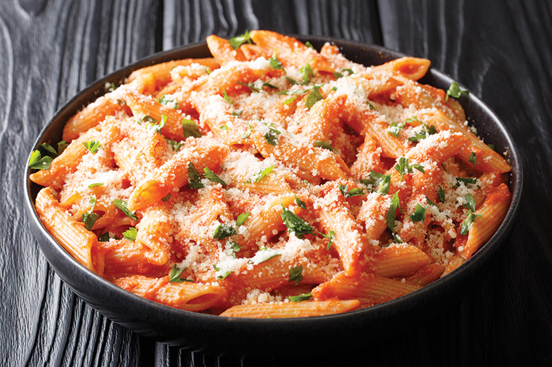 - In a medium pot of salted boiling water, cook pasta until just shy of al dente, about 3 minutes less than the package directs. About 1 minute before you transfer pasta to sauce, add vodka to tomato sauce and bring to a gentle simmer over medium heat.