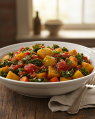 Roasted Root Vegetables with Tomatoes and Kale